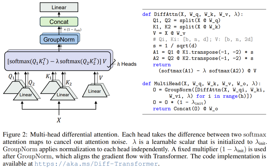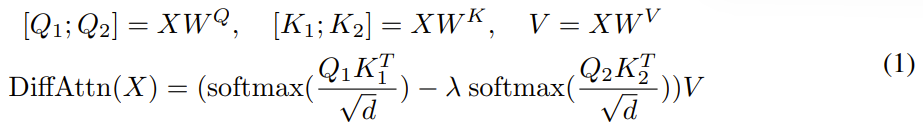 此處的關鍵設計是使用一對 softmax 函數來消除注意力分數的噪聲。具體來說,給定輸入 X,首先將它們投射成查詢、鍵和值 Q_1、Q_2、K_1、K_2、V。然后差分注意力算子 DiffAttn (?) 通過以下方式計算輸出: