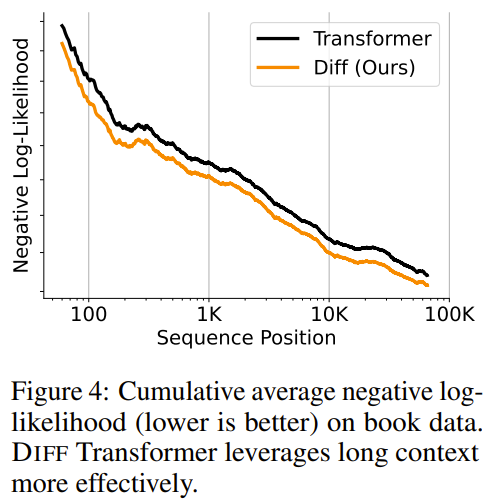 當 3B 模型上下文長度增長至 64K,模型的表現又如何呢?又使用另外 1.5B token 訓練了 3B 版本的檢查點模型之后,該團隊發(fā)現隨著上下文長度的增加,累積平均負對數似然(NLL)持續(xù)下降。差分 Transformer 得到的 NLL 值低于常規(guī) Transformer。見圖 4,這樣的結果表明,差分 Transformer 可以有效地利用不斷增加的上下文。