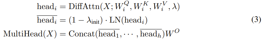 其中 λ_init 是 (2) 式中的常數標量,W^O 是可學習的投影矩陣,LN (?) 是對每個頭使用 RMSNorm,Concat (?) 的作用是沿通道維度將頭連接在一起。這里使用一個固定乘數(1 ? λ_init)作為 LN (?) 的縮放尺度,以使梯度與 Transformer 對齊。