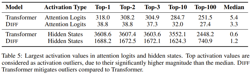 在 LLM 中,一部分激活值明顯大于大多數激活值的現象被稱為激活異常值(activation outliers)。異常值導致訓練和推理過程中模型量化困難。實驗表明差分 Transformer 可以降低激活異常值的幅度,從而可能實現更低的量化位寬。