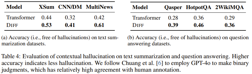 該團隊基于文本摘要和問答任務評估了模型的上下文幻覺現象。結果見表 4。