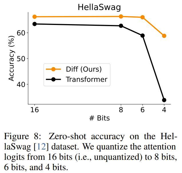 從圖中可知,即使降低位寬,差分 Transformer 也能保持較高性能。相較之下,常規(guī) Transformer 的準確度在 6 位和 4 位量化時會顯著下降。這一結果表明,差分 Transformer 本身就能緩解注意力分數中的激活異常值問題,從而可為低位 FlashAttention 的實現提供新機會。