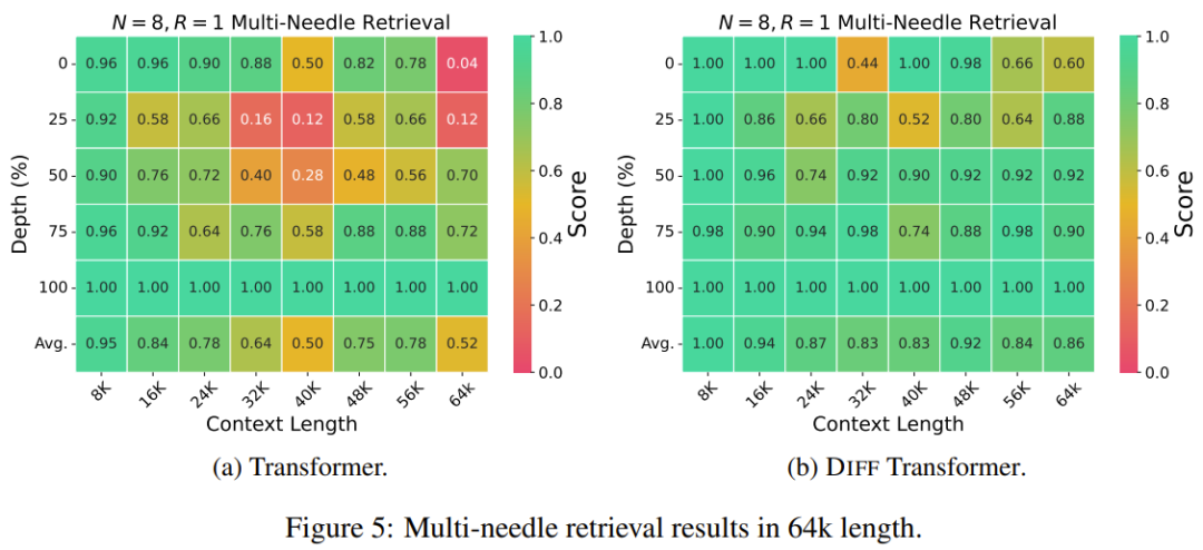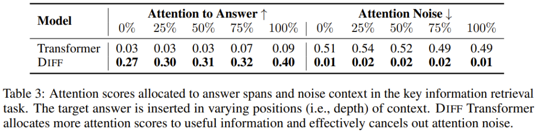 可以看到,相比于常規(guī) Transformer,差分 Transformer 能為答案范圍分配更高的注意力分數,同時為注意力噪聲分配更低的注意力分數。