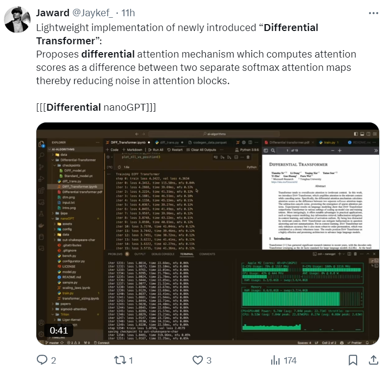差分 Transformer 的輕量實現,https://github.com/Jaykef/ai-algorithms/blob/main/DIFF_Transformer.ipynb