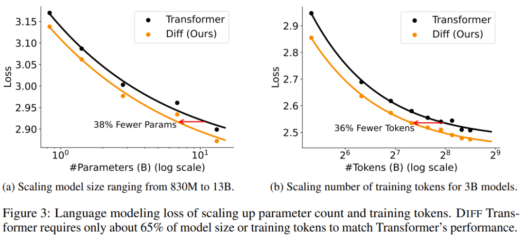 可以看到,在這兩個方面,差分 Transformer 的可擴展性均優(yōu)于常規(guī) Transformer:僅需后者 65% 左右的模型大小或訓練 token 數量就能達到相媲美的性能。