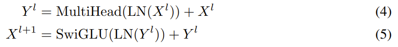 其中 LN (?) 是 RMSNorm,SwiGLU (X) = (swish (XW^G) ⊙ XW_1) W_2,且 W^G、W_1、W_2 是可學習的矩陣。