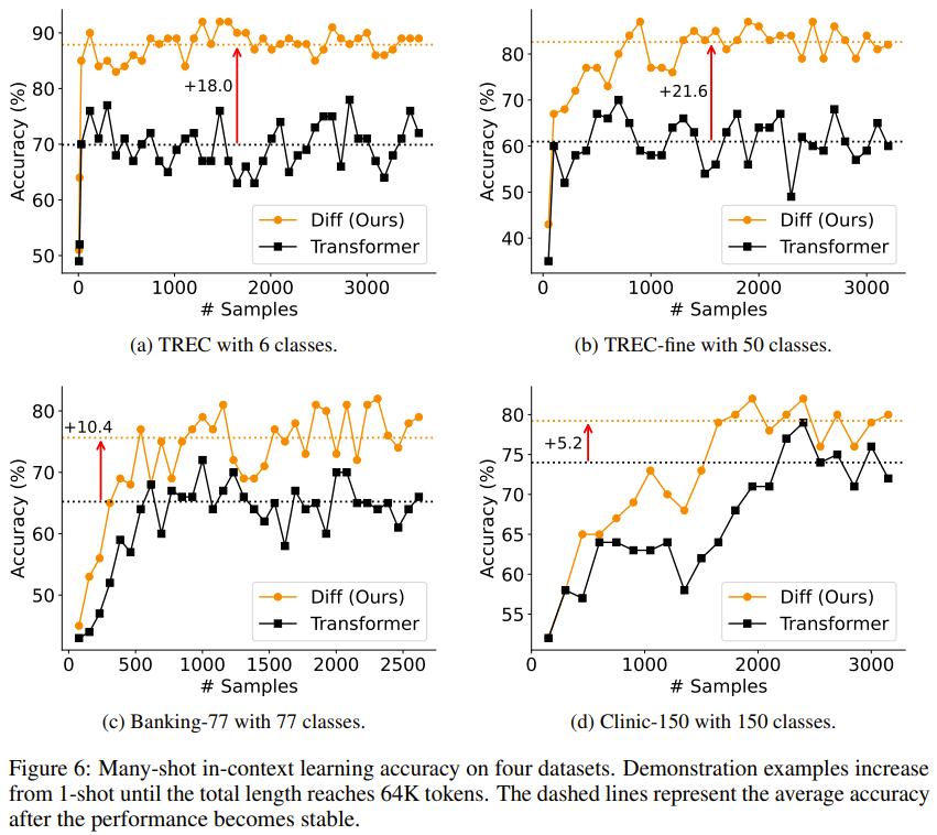 圖 6 展示了新舊 Transformer 模型的多樣本分類結果。結果表明,在不同的數據集和不同的演示樣本數量上,差分 Transformer 均穩(wěn)定地優(yōu)于 Transformer。此外,差分 Transformer 的平均準確度優(yōu)勢也很明顯,從 5.2% 到 21.6% 不等。