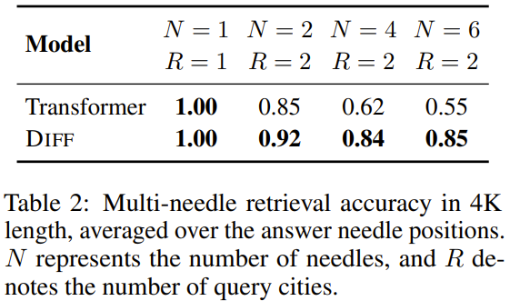 表 2 給出了 4K 上下文長度的情況,其中 N 是針的數量,R 是查詢引用的數量。可以看到,差分 Transformer 的多針檢索準確度高于常規(guī) Transformer,尤其是當針數量較多時,差分 Transformer 的優(yōu)勢會更加明顯。
