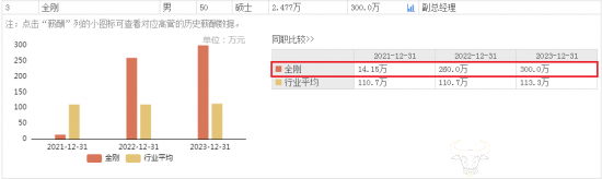 值得一提的是,根據(jù)東方財(cái)富網(wǎng)數(shù)據(jù),全剛的薪酬還是很不錯(cuò)的。上任第一年,也就是2022年全剛的薪酬為260萬,去年漲薪40萬至300萬元。