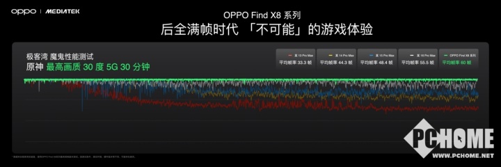 實際測試中,Find X8系列在30攝氏度的高溫環境下,實現平均 60fps的滿幀“戰神”級別的表現。與之相比,其他品牌的最新旗艦手機,在高溫的壓力下10分鐘后就會出現掉幀和幀率的波動,無法始終提供流暢的游戲體驗。
