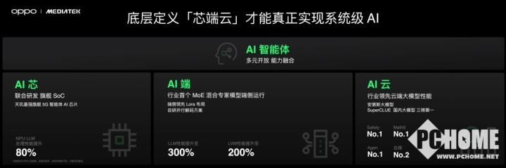天璣9400有著5G智能體AI芯片,為系統級AI提供強大算力支持。在端側,OPPO與MediaTek首次實現 MoE (混合專家)模型的端側運行,并率先在端側布局Lora架模型,結合OPPO自研的并行解碼方案,讓端側大語言模型和視覺模型的性能分別提升300%和200%。