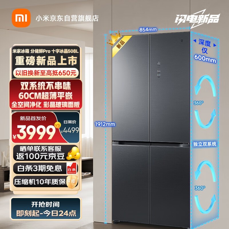 ?小米508L十字對開四開門冰箱:3370元-優游風采